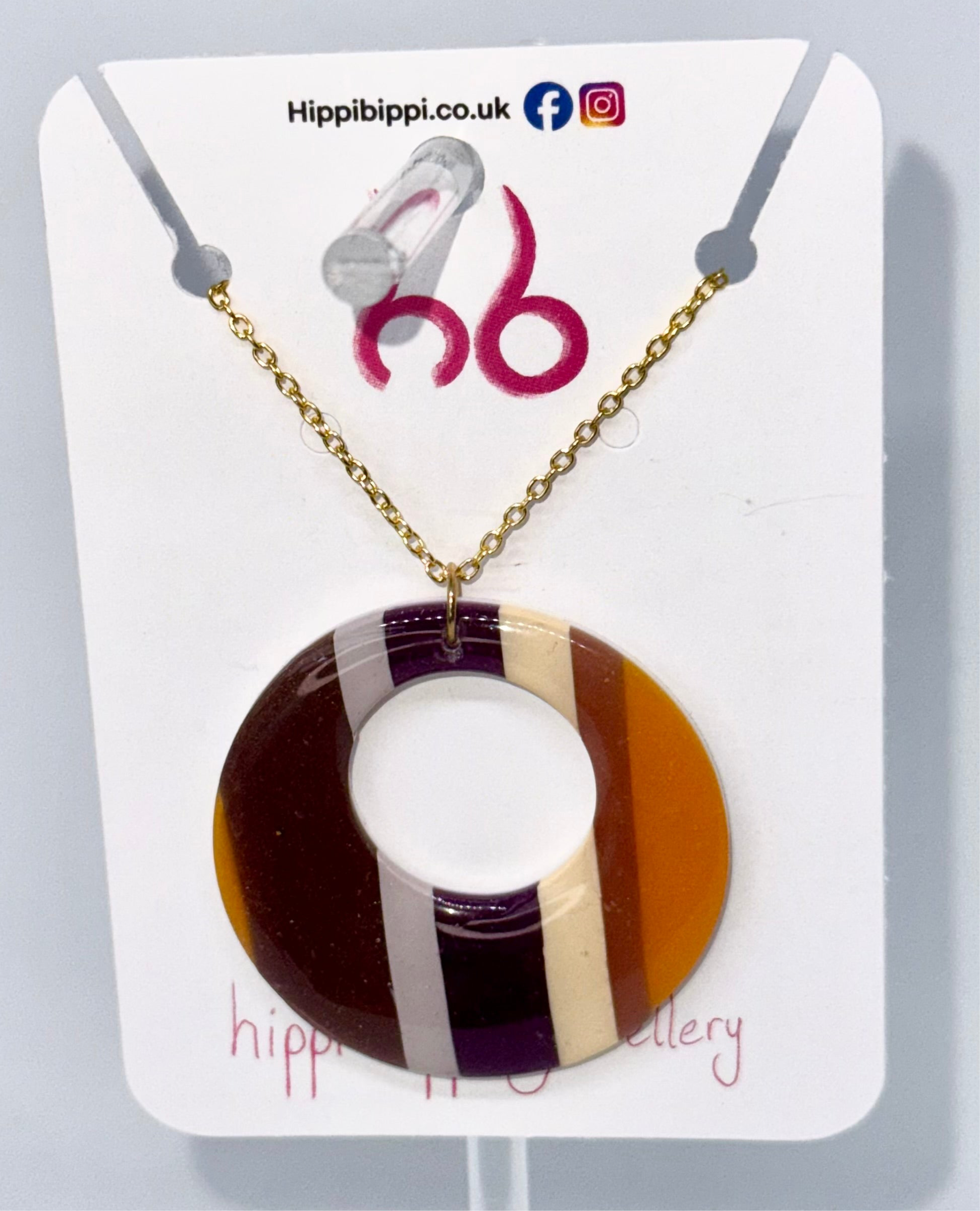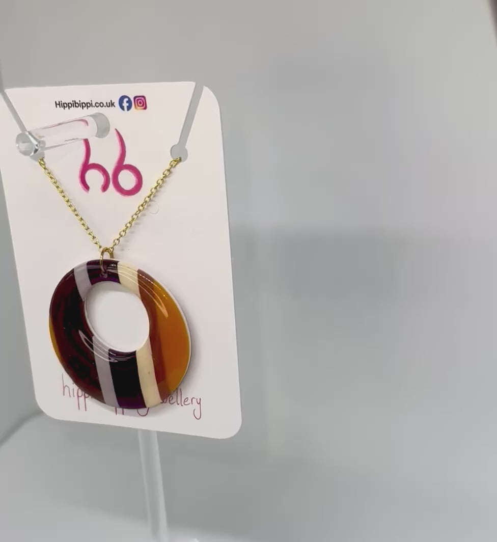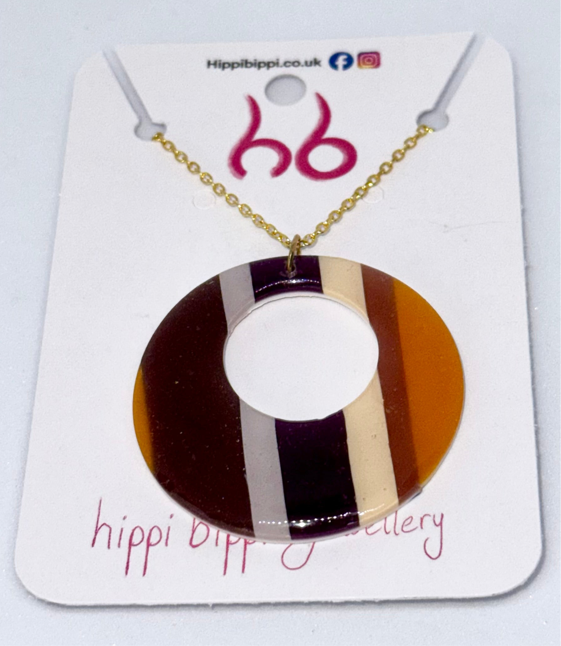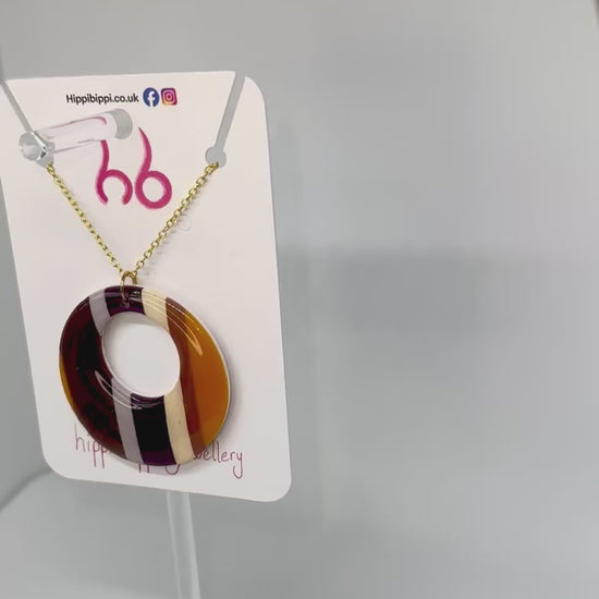 This circular pendant is handcrafted from polymer clay in shades of brown, grey, purple, and orange. It features an off-centre cut-out and a glossy UV resin finish. The pendant is hung on a silver-plated chain.